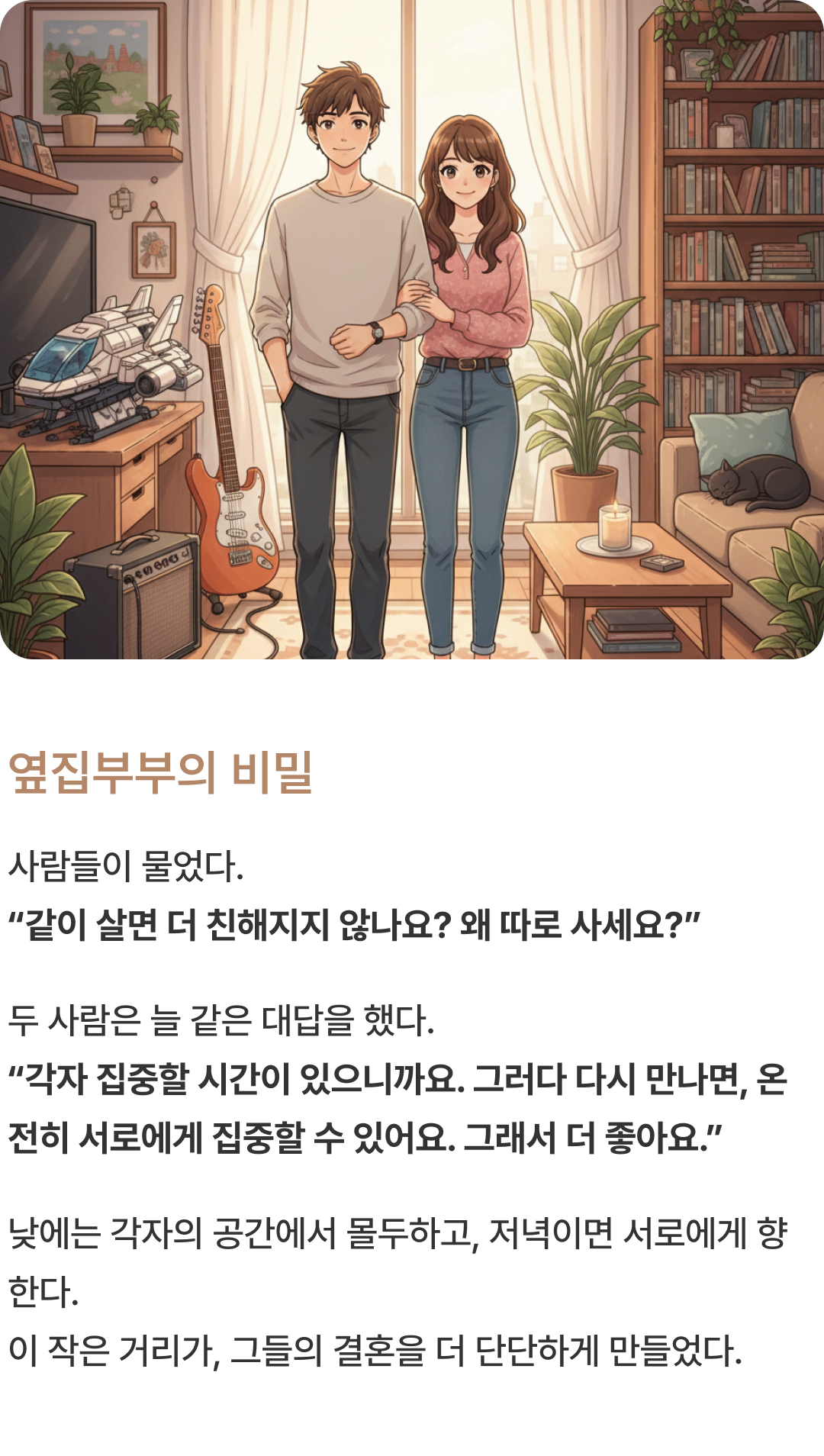 • 서로 다른 것을 인정하니 부부 사이 오히려 돈독해지더라┃은퇴 후 각자의 삶을 인정하고 두 집 짓고 사는 현명한 부부